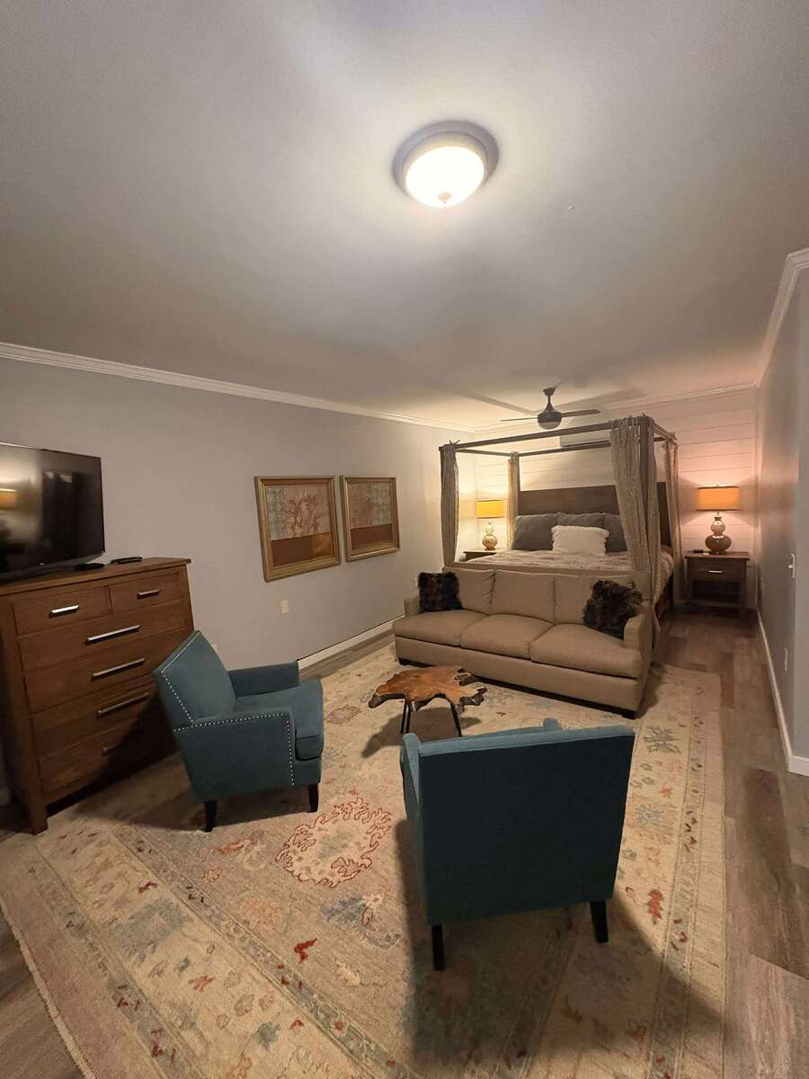 The Magnolia Suite offers a spacious retreat with a luxurious king-size canopy bed and elegant, cozy decor. A comfortable sitting area with plush chairs and sofa creates the perfect space to unwind, while modern amenities like a flat-screen TV and in-room refreshment station add convenience. The private bath features a walk-in tiled shower and contemporary finishes, blending comfort with refined style. Ideal for couples seeking extra space and relaxation.