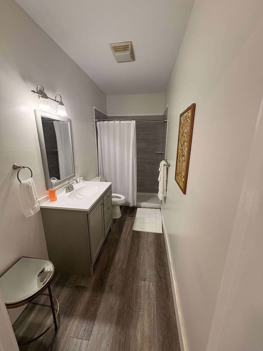 The Willow Suite combines comfort and accessibility, offering a queen-size bed and warm, inviting decor. A spacious bath features a roll-in shower, accessible fixtures, and modern finishes to ensure ease and comfort for every guest. A welcoming retreat that blends charm, style, and convenience.